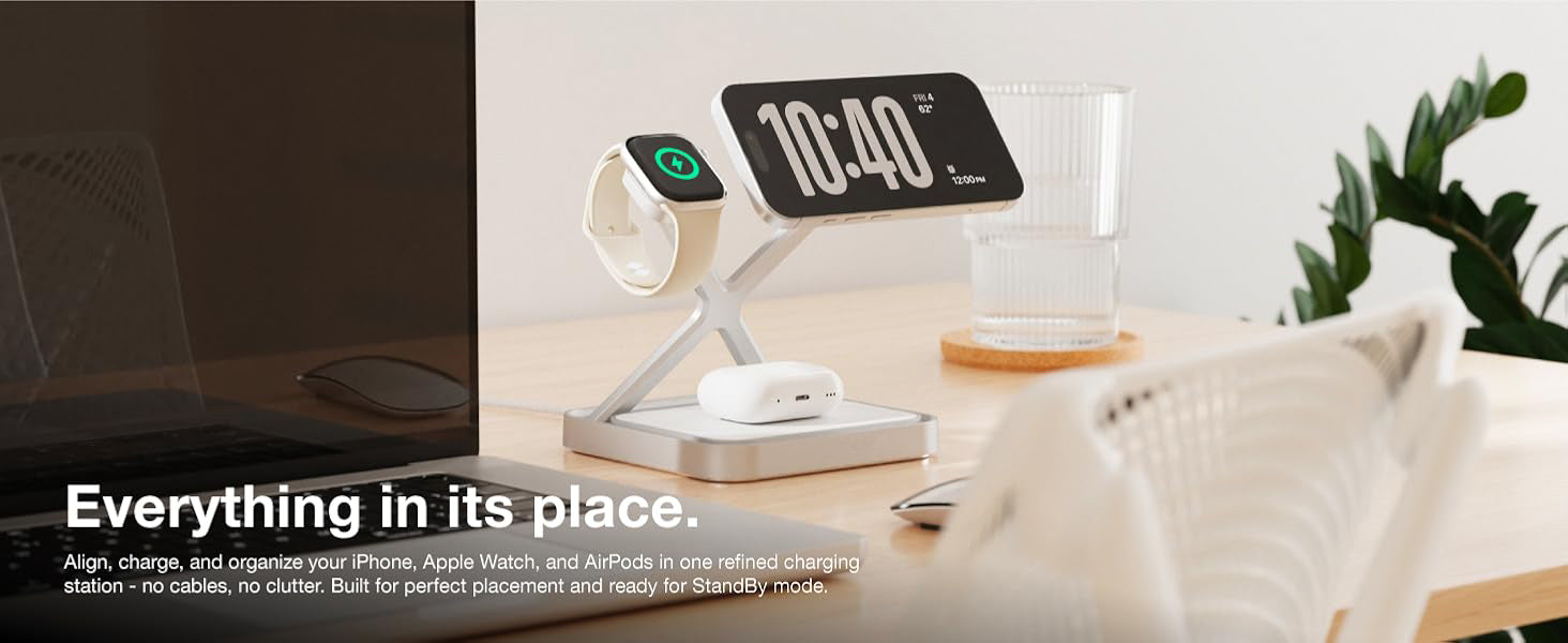 This one-stop charging base organizes and charges your devices simultaneously without the mess of wires. Designed for perfect alignment, your iPhone, Apple Watch, and AirPods are always in the charging position, keeping them ready to go while maintaining a neat workspace.