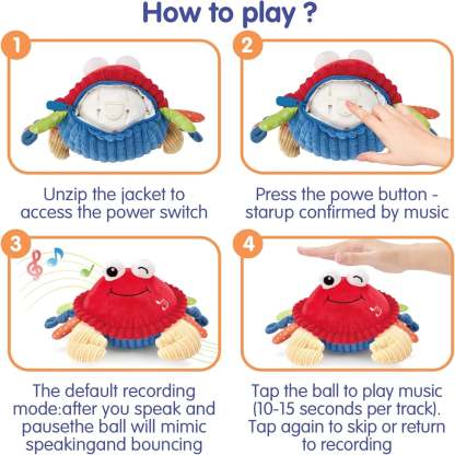 This interactive crawling crab toy is designed to engage and entertain babies during key developmental stages. With dancing, walking, bouncing movements and musical interaction, it encourages babies to move, chase, and explore—supporting motor skill development, coordination, and early learning through play.