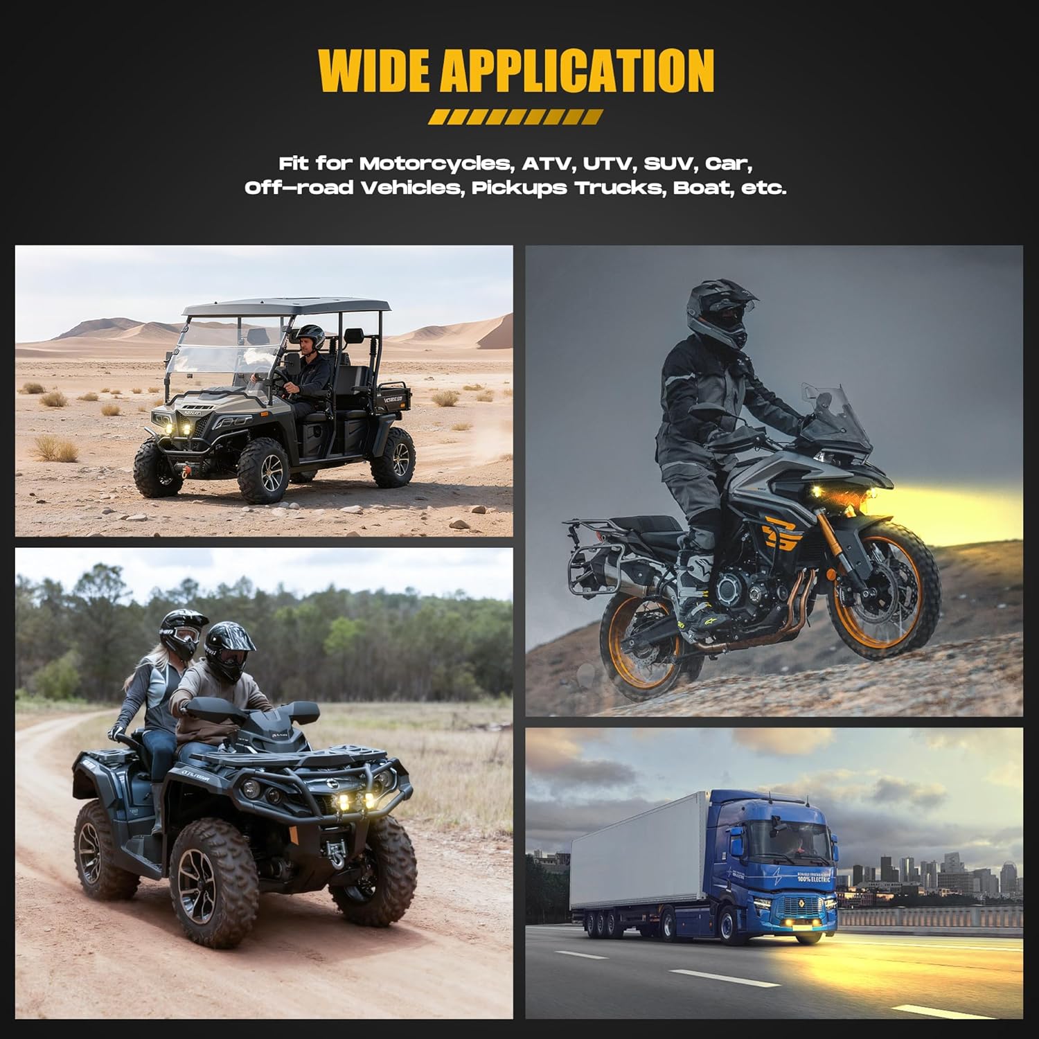Equipped with 60W amber LED fog lights, suitable for both high and low beams (up to a total of 120W), these motorcycle driving lights offer ultra-bright performance for nighttime riding and off-road conditions. Features include strobe, left-right flashers, DRL (Daytime Running Lights), and emergency horn-synchronized strobe for full visibility in any riding environment.