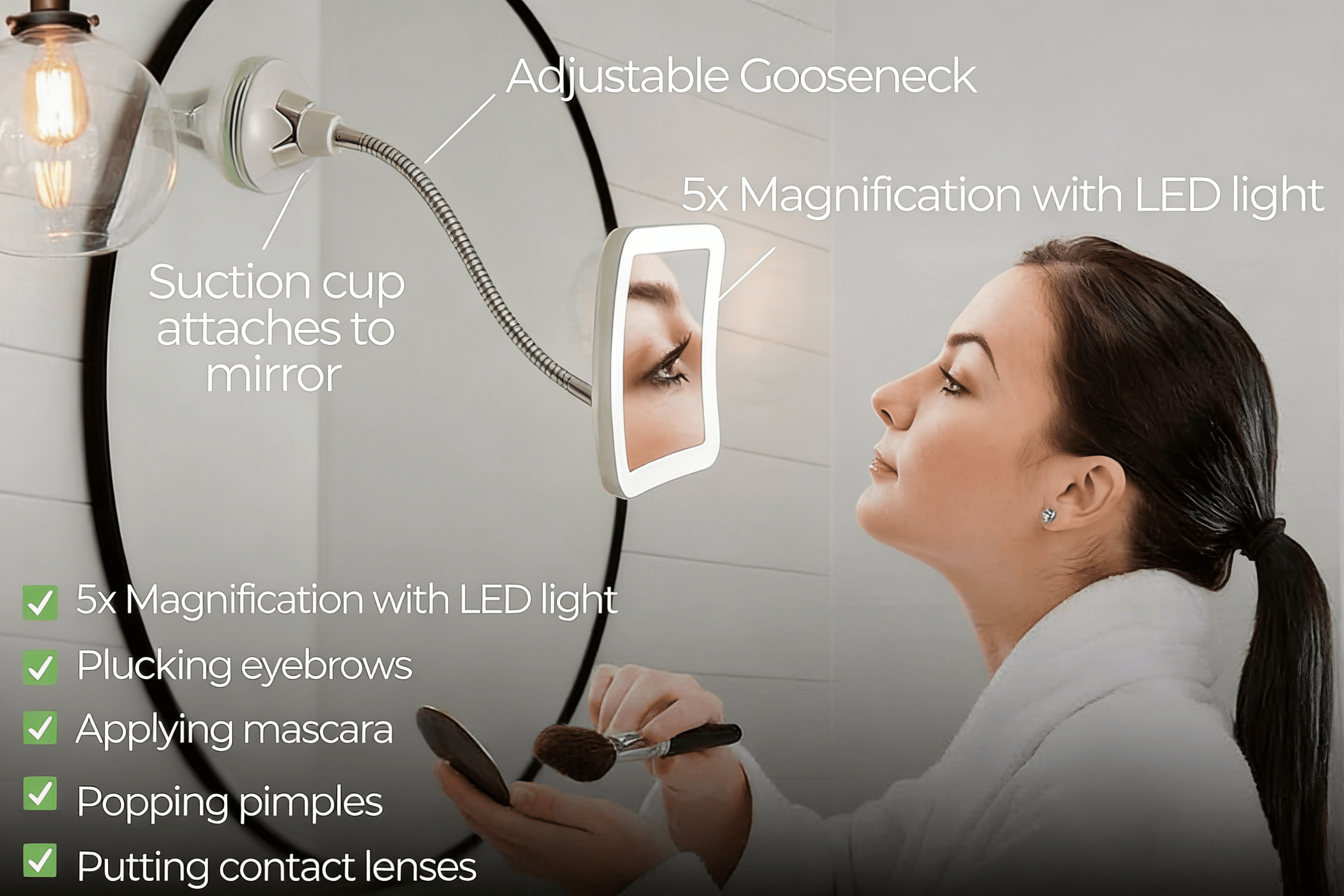 This isn't your ordinary mirror! Designed for ultimate convenience, it features a powerful suction cup that sticks securely to any smooth glass surface and a super-flexible gooseneck that holds any position. No cords, no screws, no mess—just perfect, bright light and magnified clarity whenever you need it. It’s the hassle-free solution for creating your ideal vanity setup anywhere.