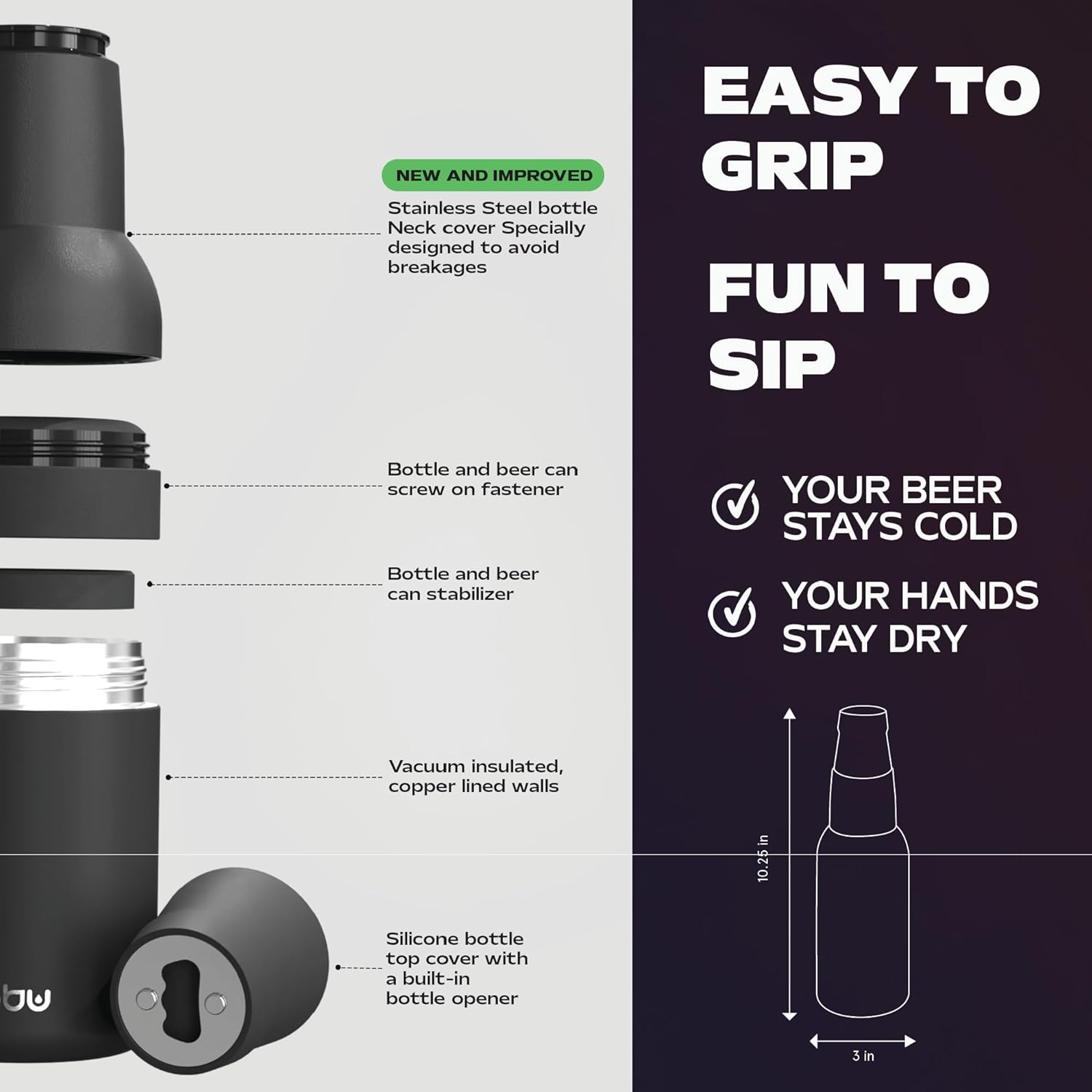 Keep your beer ice cold from the first sip to the last with this vacuum insulated beer holder. Designed to fit both standard 12oz cans and bottles, it eliminates the need to switch coolers while delivering long-lasting chill. Featuring a built-in bottle opener and a durable, stylish design, it’s an essential accessory for BBQs, beach days, camping trips, and casual hangouts.