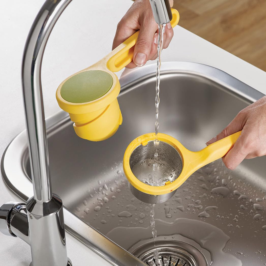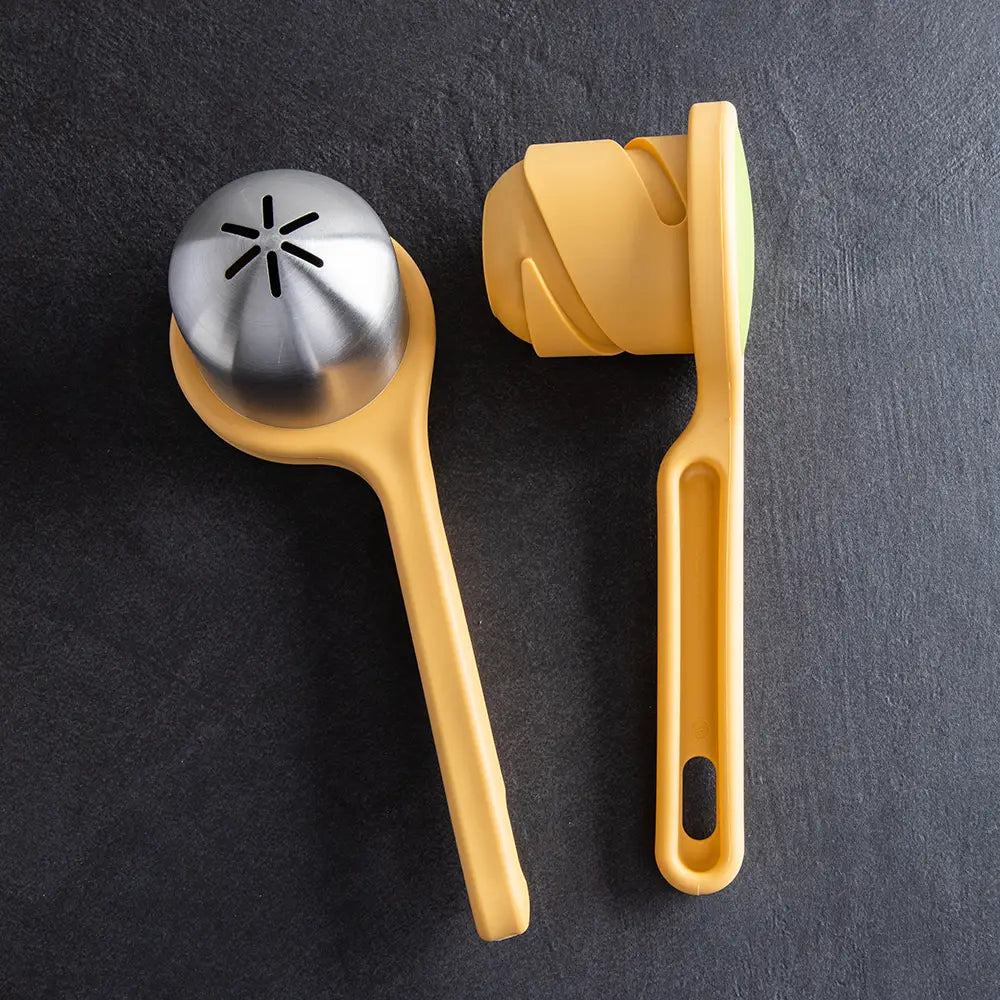 This ergonomic twist-action citrus juicer is designed to make extracting fresh juice from lemons and limes effortless. Featuring a durable stainless-steel and nylon construction, it delivers efficient performance while ensuring food safety. The bright yellow design adds a fresh touch to any kitchen.
